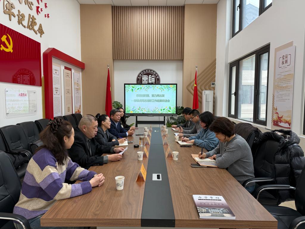 会上,北辰区实验中学负责同志详细介绍了穆银虎同志一年来的挂职工作情况。指出,穆银虎同志挂职期间始终坚守初心、履职尽责,深度投身学校教育教学管理、办学章程体系汇编、思政课题研究、教师团队建设等多项重点工作。凭借扎实的专业功底、务实的工作作风和高效的执行能力,在各领域取得显著成效,为学校规范化发展注入新活力,其敬业精神与工作实绩赢得全校师生的广泛赞誉。